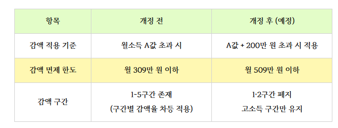 | 감액 적용 기준 | 월 소득 A값 초과 시 | 월 소득 A값 + 200만 원 초과 시 |
