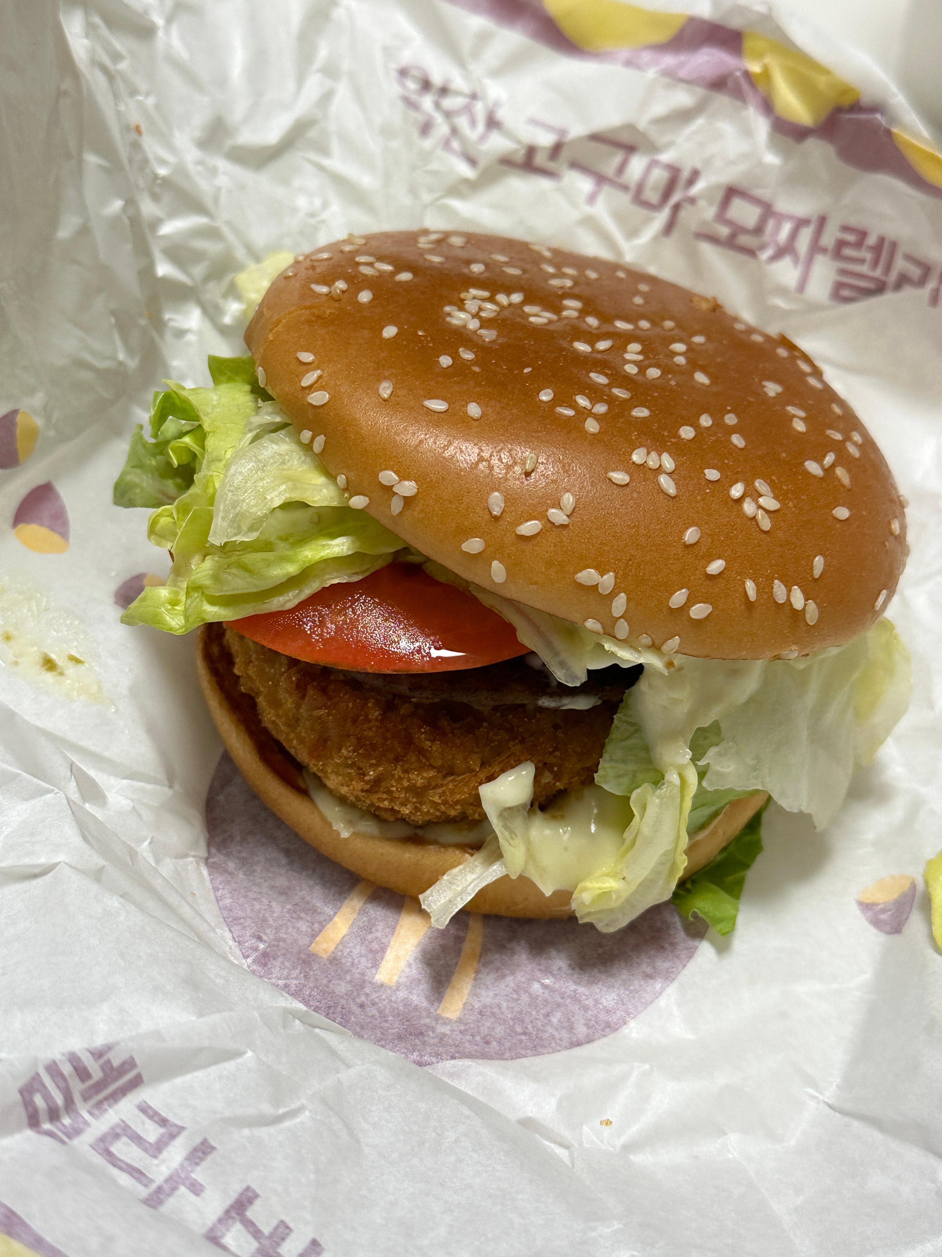 포장지를 열자마자 고소한 냄새가 확 풍겨왔습니다. 번을 살짝 들어보니 속 재료가 아주 알차게 들어 있었어요. 신선한 양상추와 토마토, 두툼한 순쇠고기 패티, 그리고 오늘의 주인공인 고구마 모짜렐라 크로켓, 마지막으로 매콤한 할라피뇨 마요 소스가 넉넉하게 뿌려져 있었습니다. 재료들의 색 조합도 좋고, 두께감도 상당해서 아주 먹음직스러워 보였어요.